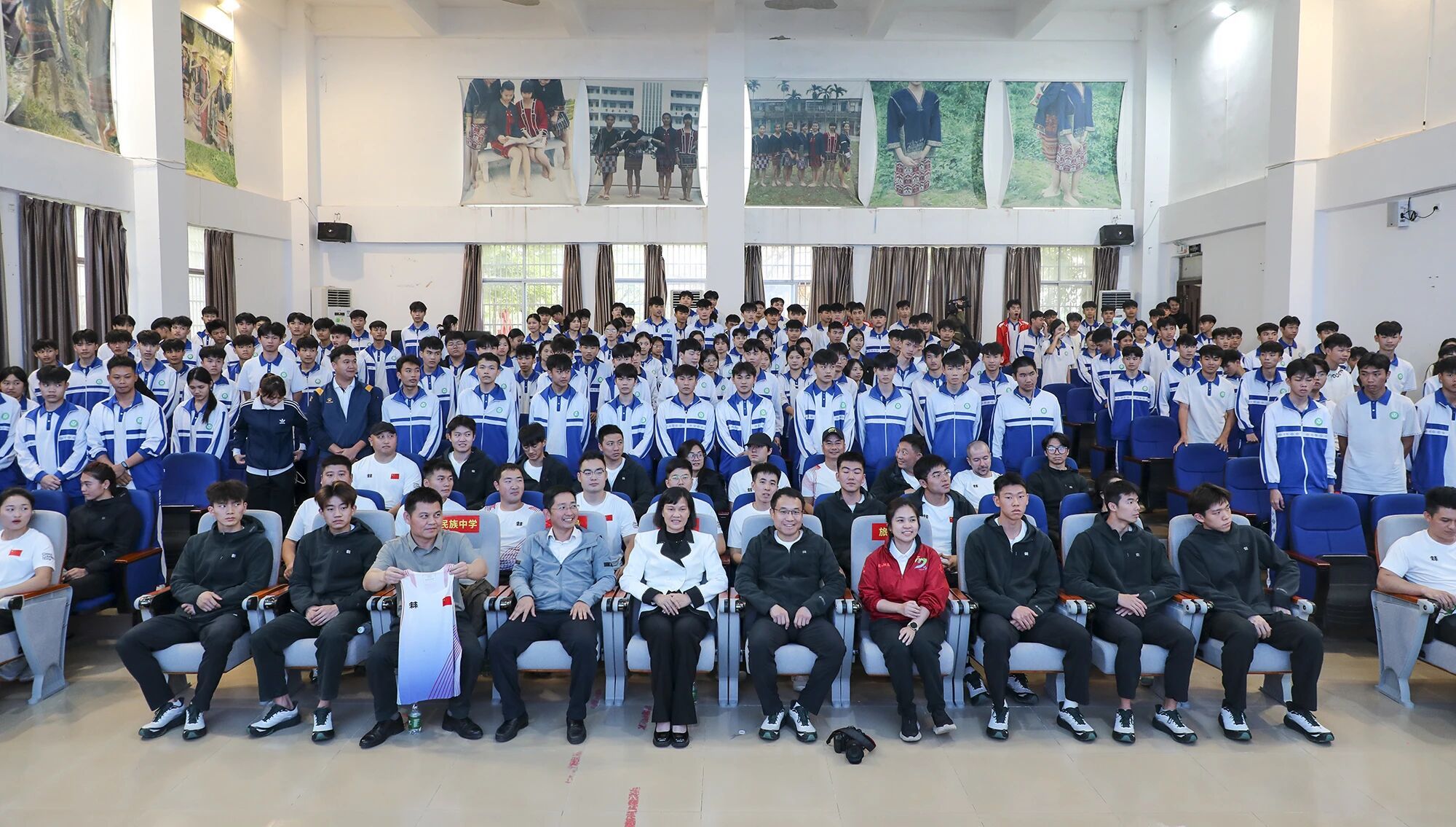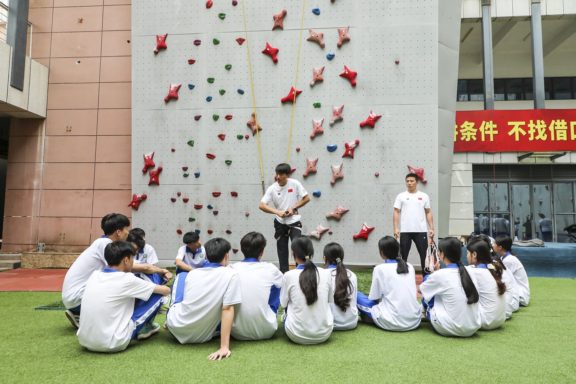 在白沙民族中學(xué)報告廳里,國家攀巖隊(duì)速度組總教練鐘齊鑫和隊(duì)員伍鵬,講述了從普通少年到奧運(yùn)選手的追夢路。在訓(xùn)練基地攀巖隊(duì)訓(xùn)練場,學(xué)生們近距離觀摩專業(yè)訓(xùn)練,部分同學(xué)還系上安全帶親身嘗試。(記者祁夏)