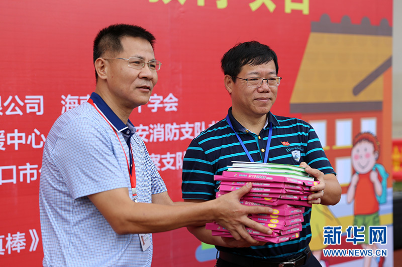 海南省紅十字會(huì)常務(wù)副會(huì)長(zhǎng)周瑾(左)代表海南省紅十字會(huì)向?谑杏裆硨(shí)驗(yàn)學(xué)校贈(zèng)送救護(hù)知識(shí)書(shū)籍。