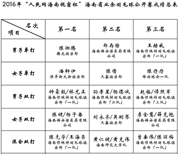 2016“人民網(wǎng)海南視窗杯”海南省業(yè)余羽毛球公開賽由海南省文體廳指導(dǎo),?谑形捏w局支持,人民網(wǎng)海南頻道主辦,人民網(wǎng)海南頻道大型活動部、海南快點體育文化發(fā)展有限公司承辦,海南大學(xué)、海南醫(yī)學(xué)院第一附屬醫(yī)院、海南醫(yī)學(xué)院第二附屬醫(yī)院、?陉柟饣@球羽毛球體育館協(xié)辦。(吉羽 符武平)