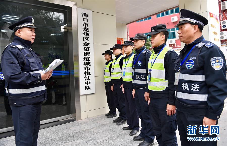 12月30日,海口市金貿(mào)街道城市執(zhí)法中隊(duì)中隊(duì)長(zhǎng)、金茂派出所民警韓統(tǒng)疇(左一)在布置執(zhí)法任務(wù)。