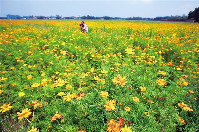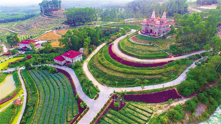 萬寧市東山嶺腳下的永范村,村民們自籌自建的千畝花海基地。 海南日?qǐng)?bào)記者 張杰 通訊員 曾覺 攝