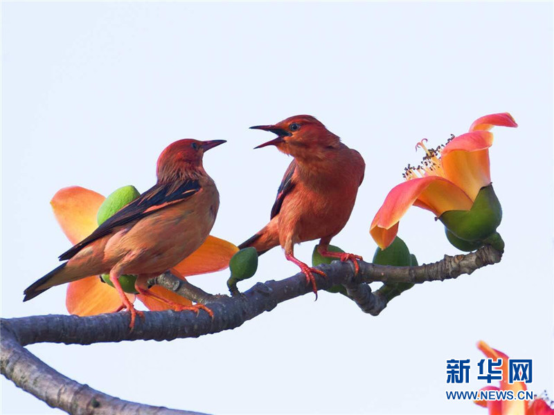 春歸大地,?谝恍^(qū)一株木棉樹上來了兩只可愛的小鳥,配合紅碩木棉花吱喳逗趣。(新華網(wǎng)發(fā) 馬亮亮攝)