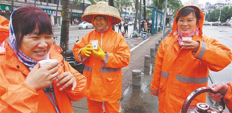 1月9日,寒風(fēng)冷雨,在?谑泻方诸^,外出作業(yè)的環(huán)衛(wèi)工人們喝下一杯杯熱乎乎的紅糖姜茶。兩日來,海南氣溫“大跳水”,?谑协h(huán)衛(wèi)局部署企業(yè)做好防寒工作,為環(huán)衛(wèi)工人送去熱茶和關(guān)愛。