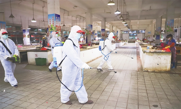 2月24日,在定安縣定城鎮(zhèn)農(nóng)貿(mào)市場,專業(yè)人員在開展消殺工作。