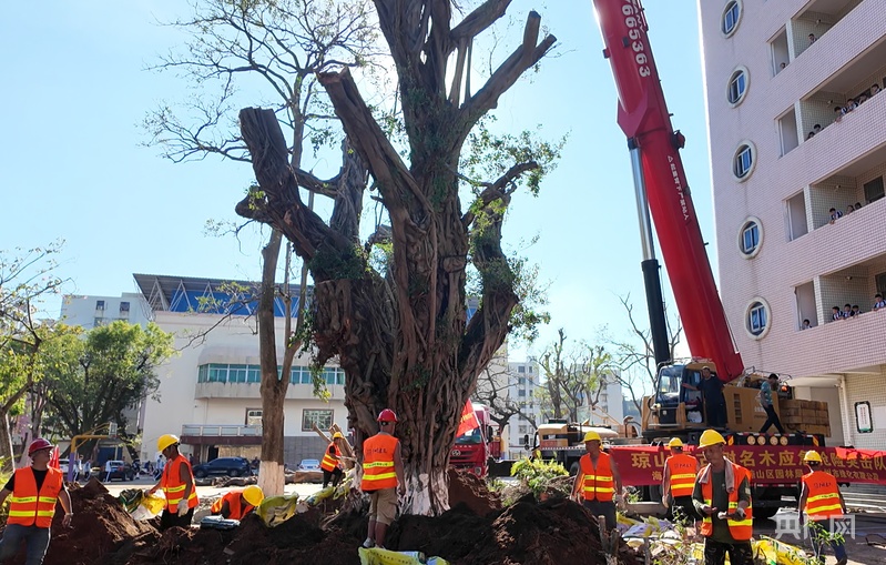 海口百余年古樹被臺(tái)風(fēng)連根拔起 廣州綠化工人緊急救援