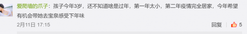 網(wǎng)友@愛爬墻的爪子:孩子今年3歲,還不知道啥是過年,第一年太小,第二年疫情完全居家,今年希望有機(jī)會(huì)帶她去寶泉感受下年味