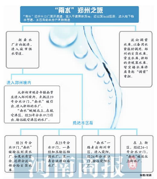 沿鄭州境內(nèi)的干渠,“南水”一邊“走”一邊分出18支小分隊(duì),朝著鄭州各區(qū)域的水廠、水庫(kù)進(jìn)發(fā)。