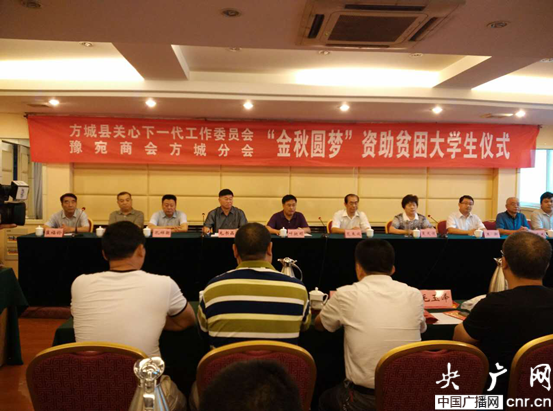 央廣網(wǎng)河南分網(wǎng)消息 8月18日,在河南省方城縣關(guān)工委、豫宛商會方城分會“金秋圓夢”資助貧困大學(xué)生活動儀式上,來自方城縣的57名貧困大學(xué)生每人領(lǐng)到了3000元的“愛心圓夢大學(xué)”助學(xué)金。方城縣縣委副書記葉挺碩,方城縣委常委、組織部部長潘自欽,方城縣政府副縣長馬偉,方城縣關(guān)工委執(zhí)行主任夏天俊等出席捐贈活動。