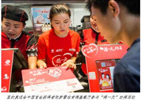 “傳播公益是一種愛。我希望讓家人、周邊的朋友和百勝中國(guó)的顧客和員工一起,參與到‘捐一元’的公益項(xiàng)目中!鼻淙菖勘硎荆骸拔覀円米约旱男袆(dòng)讓孩子和更多的人能明白,人幸福的時(shí)候,更要懷揣感恩與憐憫之心。生活有許多不易之處,但彼此心里有愛、互相幫助,艱難的情況就會(huì)有所改善,生活的快樂也會(huì)隨之而來。”