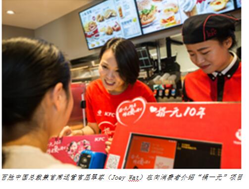 該項(xiàng)目自2008年啟動(dòng)以來,累積超過1億人次消費(fèi)者在百勝中國(guó)旗下餐廳直接參與捐款,該項(xiàng)目已經(jīng)成為中國(guó)參與人數(shù)最多的群眾性募捐項(xiàng)目之一。過去九年,捐一元項(xiàng)目累計(jì)籌款達(dá)到人民幣1.5億元,為貧困地區(qū)小學(xué)生提供了3000多萬份營(yíng)養(yǎng)加餐,為750余所貧困山區(qū)學(xué)校捐贈(zèng)了“愛心廚房”設(shè)備,8個(gè)省份超過40萬名學(xué)生從中受益。