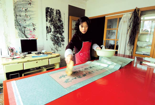 “宣紙和漿糊的質(zhì)量好,可延長書畫的保存期。”梁福平說,她裝裱用的漿糊都是自己特制的,宣紙也是自己到宣紙生產(chǎn)廠家定制的。刷漿糊時,要先用手試其厚薄,漿糊用得多,裱好的書畫容易發(fā)硬、出現(xiàn)瓦卷;漿糊用得少,則容易脫層。