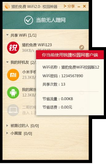 學生只要安裝運行獵豹免費WiFi2.0-校園神器,就能將電腦瞬間變成免費WiFi,從而讓手機、PAD等無線設備免費上網(wǎng)。而且,一個寢室的同學不用每人都辦理校園網(wǎng)套餐,可以共享同一校園網(wǎng)賬號,從而幫助學生減輕經(jīng)濟負擔。