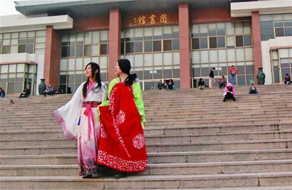 昨天下午,農(nóng)大圖書館前,大學(xué)生們?nèi)宄扇鹤谂_階上看書,中間兩個穿著漢服的女孩特別引人注目!敖(jīng)?吹剿齻冞@樣穿!薄白餍惆!”“在排練情景劇?”學(xué)生們對此似乎見怪不怪,但都說不出她們到底在干什么。說話間,兩名“漢服女孩”起身,一路聊一路走著,校園林蔭道、教室里、小河邊,兩人的出現(xiàn)成了一道獨(dú)特的風(fēng)景,每到一處立馬引來同學(xué)們的目光。