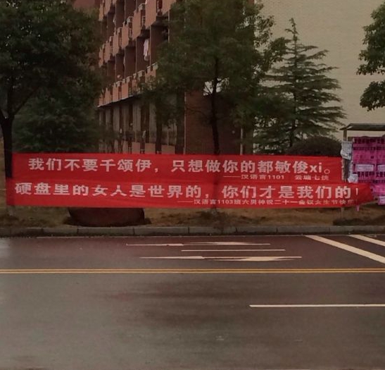 當(dāng)然雷人的標(biāo)語(yǔ)也不少,比如“今天你不陪她過(guò)女生節(jié),明天別人就帶她過(guò)婦女節(jié)!”、“硬盤里的女人是世界的,你們是我們的!”等雖然也反映了高校生活某些方面,但思想境界并不高。