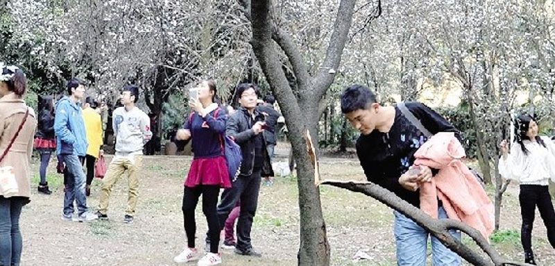 昨日,多名武大學(xué)生反映,他們在校內(nèi)情人坡看櫻花時,不僅發(fā)現(xiàn)一些游客隨意采摘櫻花,還發(fā)現(xiàn)一棵3米多高的櫻花樹的樹枝慘遭人為折斷(如圖)。