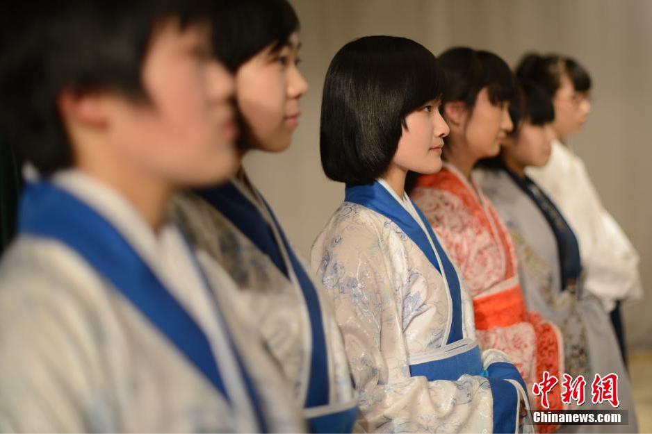 央廣網(wǎng)河南分網(wǎng)消息 據(jù)中新網(wǎng)報(bào)道:3月23日,山西太原漢文化社走進(jìn)當(dāng)?shù)刂袑W(xué),邀請(qǐng)200余名中學(xué)生身著漢服,體驗(yàn)千年華夏禮儀,同時(shí)向他們介紹了博大精深的漢服文化。(韋亮 攝)