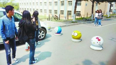 昨日,記者來到吉林農(nóng)大,在經(jīng)過一番打聽和尋找之后,在該校一座食堂樓前找到了這幾個可愛的路障。記者看到,食堂門前的這條路兩側(cè)各有5個圓球形的路障,靠近食堂的這5個路障中,有3個被人涂鴉。不僅有哆啦A夢、小黃人,還有女生們喜歡的Hello Kitty。由于正值午飯時間,校園里往來于食堂的學(xué)生們路過此處都會駐足看上兩眼,“太有才了,好像大頭娃娃,太可愛了。”議論之余,一些學(xué)生還掏出了手機(jī)拍照留念。