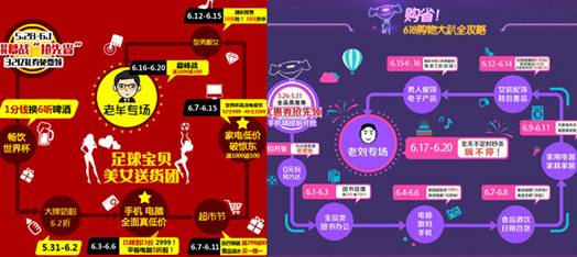 在京美大戰(zhàn)前期,國美在線推出32億現(xiàn)金券PK京東16億優(yōu)惠券,隨后聯(lián)合百度推出1分錢換6聽啤酒暢飲世界杯活動,京東則推出0元玩轉(zhuǎn)萬達(dá)活動,“免費(fèi)”成為了二者這個促銷階段的共同之處。進(jìn)入6月之后,國美在線提前截流京東3C大促,推出手機(jī)電腦真低價活動,時間比京東提前了1天。接下來,二者主打的品類皆為家電、服裝,最后,雙方最高層領(lǐng)導(dǎo)將為自家商城站臺,以“老牟專場”與“老劉專場”的對決形式展現(xiàn)。
