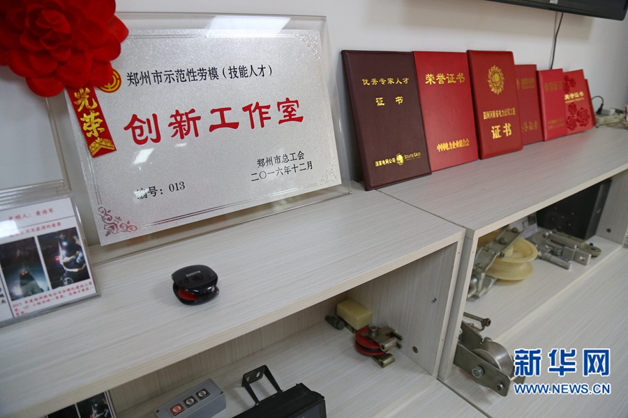 在國網(wǎng)鄭州供電公司輸電運檢室黃浩軍工作室里,自封口式軟梯支架、復合絕緣子帶電更換支架、等電位防人身墜落保護裝置、導地線牽引繩拉力實時無線檢測儀、安全防護網(wǎng)承力繩實時張力檢測、導地線LED夜間弧垂激光觀測儀等整齊排列,也見證著一位“電力工匠”的創(chuàng)新歷程。