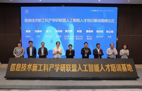 2019年5月12日上午,在全國高校人工智能及相關(guān)專業(yè)帶頭人和骨干教師、以及產(chǎn)業(yè)界的企業(yè)代表等近百位專家、學(xué)者的共同見證下,信息技術(shù)新工科產(chǎn)學(xué)研聯(lián)盟人工智能人才培訓(xùn)基地舉行了簡約而隆重的揭牌儀式。人工智能人才培訓(xùn)基地是信息技術(shù)新工科產(chǎn)學(xué)研聯(lián)盟為了有序推動新工科專業(yè)建設(shè)和人工智能人才培養(yǎng)工作,促進(jìn)教育界和產(chǎn)業(yè)界形成合力,在浙江省德清設(shè)立,基地將積極倡導(dǎo)、引領(lǐng)和推進(jìn)人工智能專業(yè)建設(shè),構(gòu)建產(chǎn)學(xué)研協(xié)同育人共同體,促進(jìn)教育和人才培養(yǎng)模式創(chuàng)新。該基地的設(shè)立也為政產(chǎn)學(xué)研聯(lián)合以共同提升人工智能人才培養(yǎng)作出了有效探索,為全國高校人工智能相關(guān)專業(yè)高端人才培養(yǎng)提供了良好的平臺,為德清打造人工智能人才培養(yǎng)高地奠定了堅實的組織機(jī)構(gòu)基礎(chǔ)。