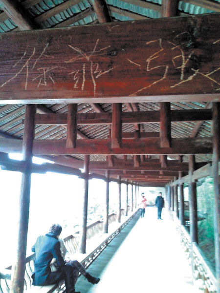 烈士公園木質(zhì)長(zhǎng)廊建于本世紀(jì)初,三層的長(zhǎng)廊為全木結(jié)構(gòu)。該場(chǎng)所一直是市民、游客休閑娛樂的好去處。記者昨日在長(zhǎng)廊內(nèi)看到,廊內(nèi)幾乎每根柱子都被游客刻上了字跡,甚至兩米多高的橫梁上也未能幸免。從這些人留下刻字時(shí)間來判斷,有2010年刻上去的,也有2012年和2013年的,最新的是幾天前某人的“新作”,一眼望去,十分刺眼,很不和諧。