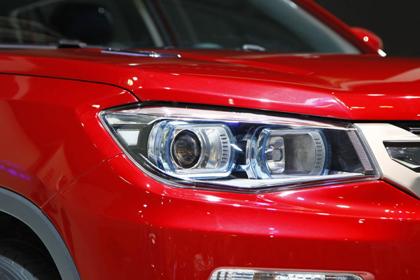 進氣格柵的形狀見棱見角,大橫幅的設(shè)計看起來立體感十足。關(guān)鍵是畫龍點睛的雙筒形前大燈(氙氣大燈),也讓前臉顯得炯炯有神。比較特別的是,CS75并沒有采用長安傳統(tǒng)的“V”型LOGO,而是直接將“CHANGAN”的拼音作為標識。當然,這一點也并非長安首創(chuàng),在其它硬派SUV中也屢見不鮮。