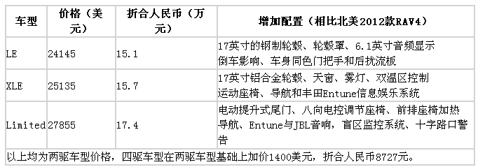 近日獲悉,第四代也就是2013款豐田RAV4將于2013年1月在北美地區(qū)上市,昨日豐田已經(jīng)公布了新RAV4在北美地區(qū)的售價(jià),新車(chē)將24145萬(wàn)美元起售。