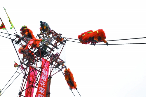 十幾米的高臺,四周用繩子牽引,獅子就利用繩子爬上高臺。隨著上面“板叉”“頭扛尾”“倒立”等驚險(xiǎn)表演,臺下不時(shí)發(fā)出驚呼聲,孩子們都看得目不轉(zhuǎn)睛,許多人拿著手機(jī)拍照,附近居民樓上許多人從窗戶里探身往外看。