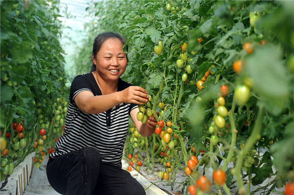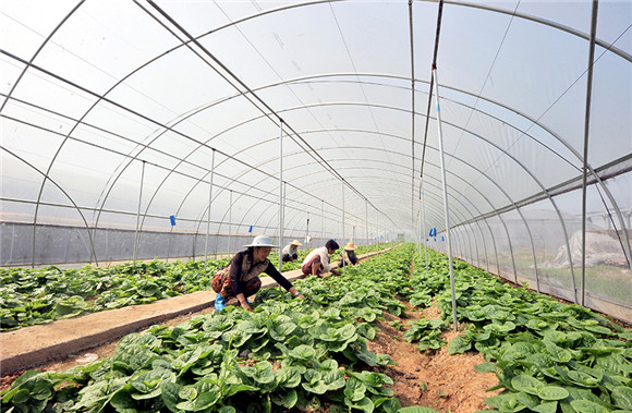 菜農(nóng)在鋼架大棚內(nèi)忙碌。謝捷 攝