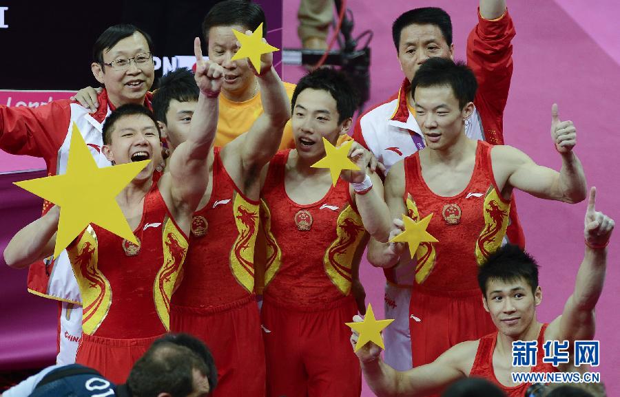 7月30日,中國(guó)體操隊(duì)隊(duì)員慶祝奪冠。當(dāng)日,在倫敦奧運(yùn)會(huì)體操男團(tuán)決賽中,中國(guó)隊(duì)以275.997分的成績(jī)成功衛(wèi)冕。 新華社記者戚恒攝