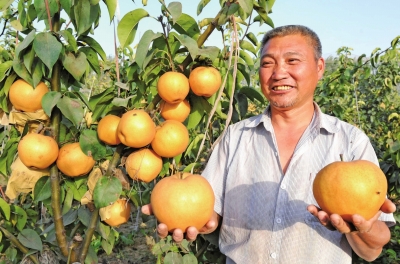 央廣網(wǎng)河南分網(wǎng)消息 據(jù)河南日?qǐng)?bào)農(nóng)村版報(bào)道:10月11日,溫縣招賢鄉(xiāng)上苑村農(nóng)民武中奇在采摘晚秋黃梨。3年前,他和其他5戶(hù)村民種植了48畝晚秋黃梨,今年開(kāi)始掛果,每畝可收獲黃梨2000公斤。 (記者 楊遠(yuǎn)高)
