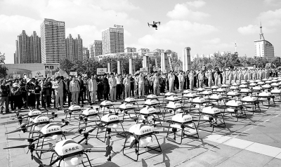 圖為千人千機(jī)小麥航空植保統(tǒng)防統(tǒng)治啟動(dòng)儀式現(xiàn)場。肖敬光攝