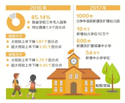 2017年,我省將啟動實施第三期學(xué)前教育行動計劃,加快公辦幼兒園和普惠性民辦幼兒園建設(shè),力爭年底前新建改擴建幼兒園1000所,新增幼兒學(xué)位10萬個;繼續(xù)實施擴充城鎮(zhèn)義務(wù)教育資源五年計劃,新建改擴建城鎮(zhèn)中小學(xué)600所,新增中小學(xué)學(xué)位54萬個,進一步解決中小學(xué)大班額問題。