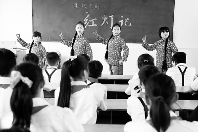 4月17日,溫縣趙堡鎮(zhèn)北平皋小學(xué)學(xué)生在課堂上表演京劇《紅燈記》。該校通過開設(shè)戲曲課、組建戲曲社團(tuán)等形式對學(xué)生進(jìn)行素質(zhì)教育。徐宏星攝