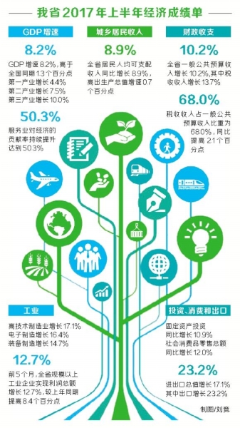 城鄉(xiāng)居民收入持續(xù)增加。在居民就業(yè)形勢穩(wěn)定、社會保障覆蓋面擴(kuò)大以及居民投資理財收入增加等因素帶動下,今年上半年全省居民人均可支配收入同比增長8.9%,高出生產(chǎn)總值增速0.7個百分點,居民收入實際增速跑贏GDP,老百姓有滿滿的“獲得感”。