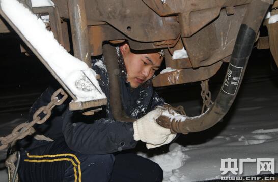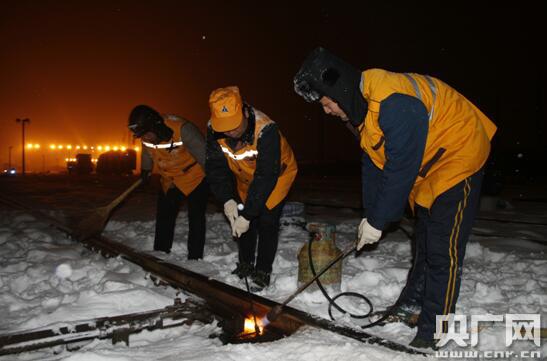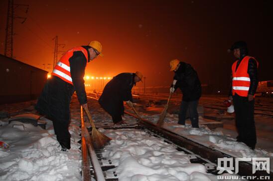 央廣網(wǎng)河南分網(wǎng)1月9日消息 近期受強冷空氣影響,豫南地區(qū)連降兩場大雪,室外溫度也低至零下10度,為確保惡劣天氣下運輸暢通,武漢鐵路局漯河火車站以雪為令,組建打冰除雪突擊隊晝夜堅守一線,不間斷地對站區(qū)道岔、廣場、站臺等關(guān)鍵處所進行清掃、涂抹防凍液。