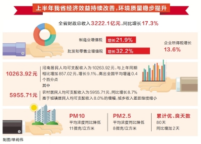 上半年河南省經(jīng)濟運行中,有兩個令人鼓舞的現(xiàn)象:“一高”——財政收入、企業(yè)效益、居民收入的增速均高于GDP增速;“一低”——全省萬元工業(yè)增加值能耗降低,藍(lán)天更多、河水更清,生態(tài)環(huán)境進(jìn)一步改善。
