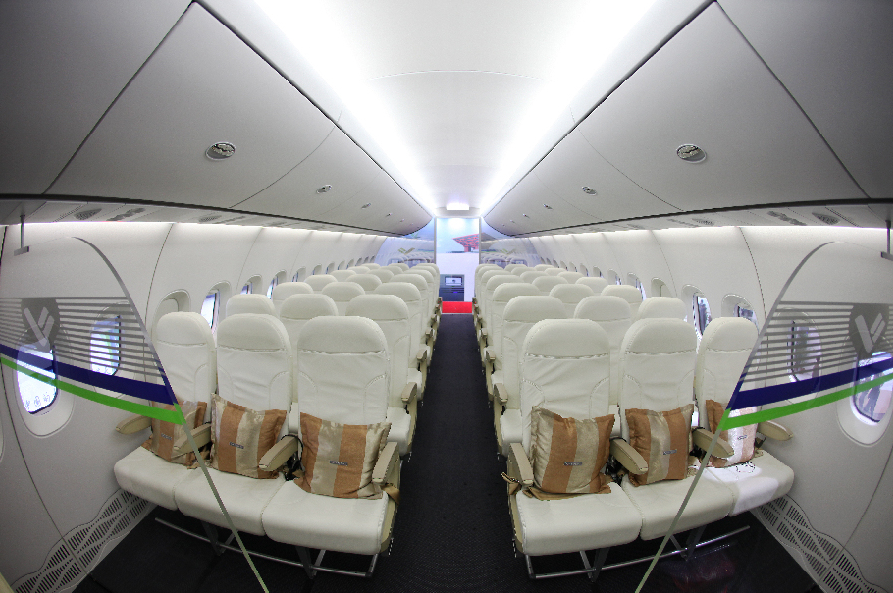 吳興世:(C919)機身特別的寬敞,在同類客機里面機身寬度最大的一種,比737寬多了,比320也略寬,大概要有5厘米左右。客艙里面每個座椅、過道寬度也比較寬敞,人站立時離天花板、以及兩手展開時與周圍的行李架等,這些個空間寬敞,乘坐的心理感受會更好。另一個方面在上下飛機、同時在安放行李時會快捷一些,給乘客帶來更好的影響。