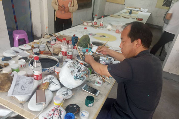 為扶持“石畫藝術(shù)”產(chǎn)業(yè)的發(fā)展,石橋鎮(zhèn)投資30余萬元,打造了“石畫小鎮(zhèn)”培訓(xùn)基地,聘請(qǐng)國(guó)家級(jí)書畫藝術(shù)工作者擔(dān)任培訓(xùn)教師,免費(fèi)對(duì)前來學(xué)習(xí)“石畫藝術(shù)”的村民進(jìn)行培訓(xùn)。中國(guó)藝術(shù)書畫院院長(zhǎng)任偉介紹:“在石頭上作畫,村民只需做好臨摹、上色等簡(jiǎn)單工作,一件精美又極具特色的石頭藝術(shù)品便誕生了。若是熟練了,村民甚至可以進(jìn)行創(chuàng)造性繪畫,真正成為一名名副其實(shí)的‘繪畫藝術(shù)者’!”