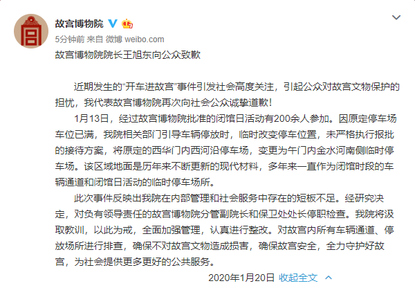 央視網(wǎng)消息:1月21日,針對近期發(fā)生的“開車進(jìn)故宮”事件,故宮博物院院長王旭東在微博發(fā)出致歉聲明,全文如下: