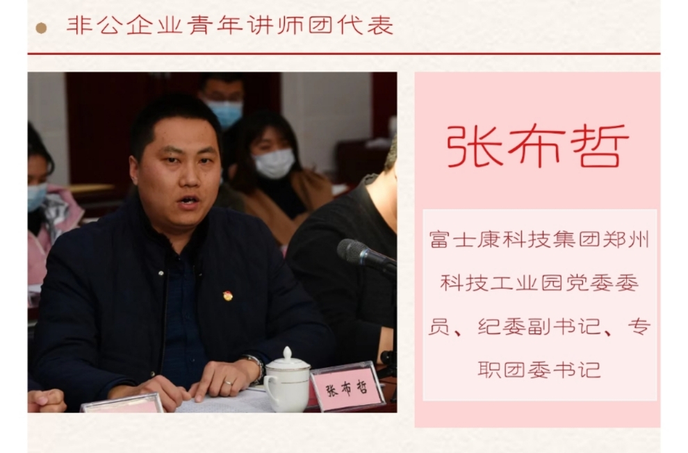 富士康科技集團(tuán)鄭州科技工業(yè)園專職團(tuán)委書(shū)記、鄭州青年講師團(tuán)成員張布哲把多年來(lái)從事基層團(tuán)建和青年工作對(duì)共青團(tuán)的理解概括成三句話:“共同的信仰,青年的夢(mèng)想,團(tuán)結(jié)的力量”,面對(duì)基層青年“2035,中國(guó)是什么樣?自己是什么樣?”的憧憬之問(wèn),他總是通過(guò)頭腦風(fēng)暴和上臺(tái)分享,再結(jié)合全會(huì)勾畫(huà)的明確藍(lán)圖,讓青少年更加直觀的理解遠(yuǎn)景目標(biāo),互動(dòng)參與式的課程得到大家的認(rèn)可。他說(shuō):“開(kāi)啟新征程,你我皆是趕路人。作為青年講師團(tuán)成員,我們一要學(xué)深悟透會(huì)議精神,結(jié)合鄭州未來(lái)發(fā)展規(guī)劃,持續(xù)學(xué)習(xí)宣傳貫徹好黨的十九屆五中全會(huì)精神,將會(huì)議精神快速傳達(dá)給廣大青少年;二要學(xué)以致用,引導(dǎo)廣大青少年在鄭州發(fā)展新征程中找準(zhǔn)定位,做好職業(yè)發(fā)展規(guī)劃,立足自身,敢于擔(dān)當(dāng),勇于作為,積極投身全面建設(shè)社會(huì)主義現(xiàn)代化國(guó)家的偉大實(shí)踐!