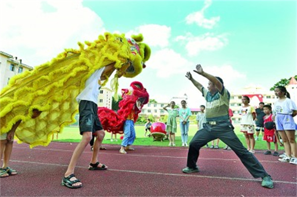 江西宜春市宜豐縣花橋鄉(xiāng)中心小學(xué)的學(xué)生在老師的帶領(lǐng)下學(xué)習(xí)舞獅的動作要領(lǐng)。周亮攝/光明圖片