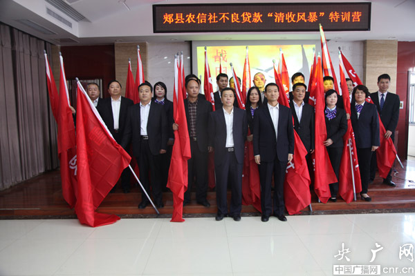 特訓(xùn)營的開班,標(biāo)志著郟縣農(nóng)信社“清收風(fēng)暴”活動(dòng)的號(hào)角已經(jīng)吹響,全體員工將思想統(tǒng)一到不良貸款清收工作上來,主動(dòng)站在維護(hù)改革發(fā)展成果的高度,樹立敢打必勝的信念,頂住壓力,克服困難,排除干擾,打出氣勢、打出聲威、打出農(nóng)信社人的精氣神,確!扒迨诊L(fēng)暴”活動(dòng)全面勝利!