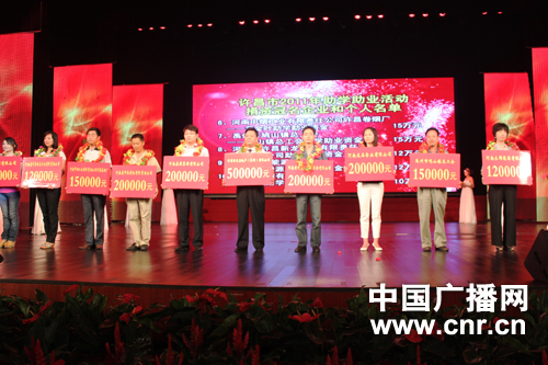 8月22日下午,“許昌市貧困助學十年總結表彰暨2011年助學助業(yè)資金發(fā)放儀式在許昌市許都大劇院舉行。市總工會向100名貧困學生代表發(fā)放了41.7萬元助學金,向9名貧困學生家長共發(fā)放了27萬元救助金。中共許昌市委書記李亞、許昌市人民政府市長張國暉、河南省總工會副主席王永領等領導出席了本次活動。