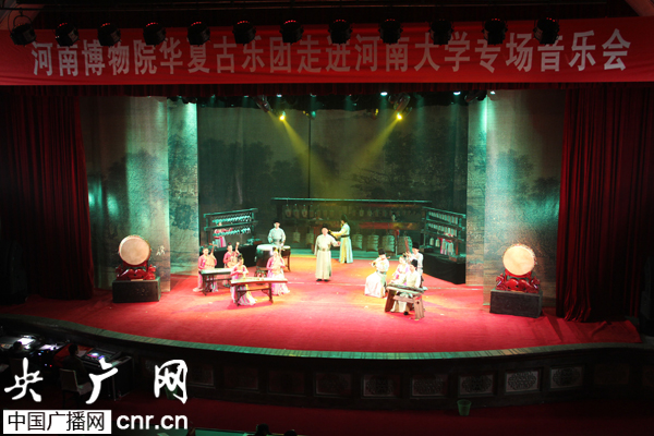 央廣網(wǎng)河南分網(wǎng)消息 八千年骨笛、五千年陶塤奏出鏗鏘沉穩(wěn)的遠古回響;三千年編鐘、兩千年古琴演繹漠野河洲的古老戀歌;翩若驚鴻、婉若游龍的輕盈舞女笑語盈盈翩然而來;12月3日晚,河南博物院華夏古樂團走進國內(nèi)高校首場演出選擇在具有百年辦學歷史和深厚文化底蘊的河南大學舉行,流傳久遠的中國古樂與國家級文物保護單位——氣勢恢宏的河大禮堂驀然“相遇”,一場“國!崩镅堇[“國寶” 的盛宴引領河大學子追尋一個古老民族文化的記憶。