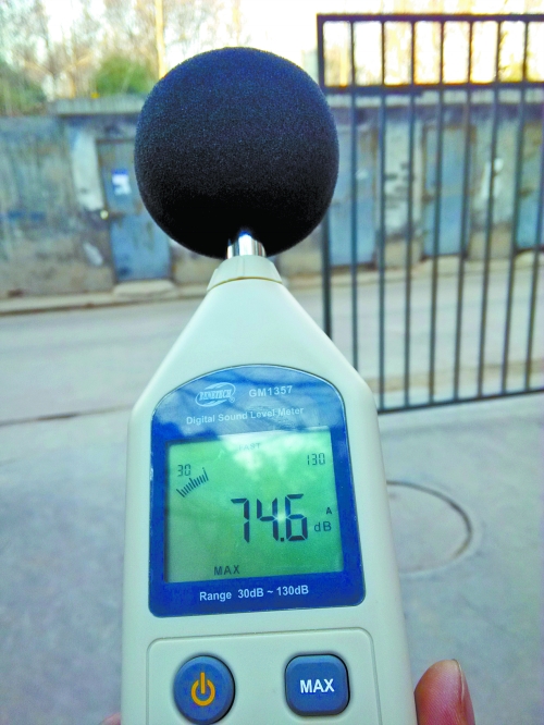 檢測(cè):記者拿出分貝儀伸出窗戶大約1米左右,1分鐘測(cè)得平均噪聲值為45分貝。隨后,記者關(guān)上窗戶,平均噪聲值為46分貝。記者來到院內(nèi)測(cè)量,交行家屬院內(nèi)1分鐘平均噪聲值達(dá)約65分貝,最高達(dá)74.6分貝;隔壁家屬院內(nèi)1分鐘平均噪聲值達(dá)約67分貝。