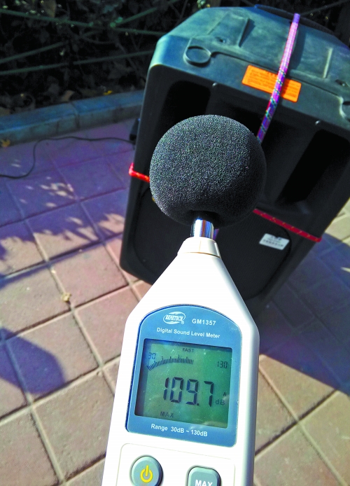 檢測(cè):記者也用分貝儀對(duì)這個(gè)大擴(kuò)音喇叭進(jìn)行測(cè)量。當(dāng)分貝儀放在喇叭邊時(shí),1分鐘測(cè)得的平均噪聲值為109.7分貝左右;距離喇叭10米處,1分鐘平均噪聲值為98分貝。