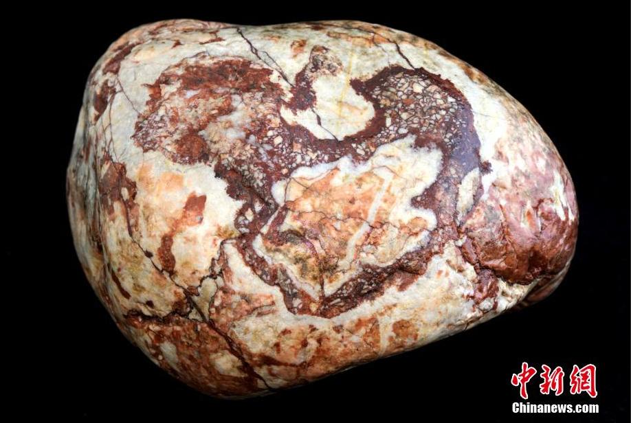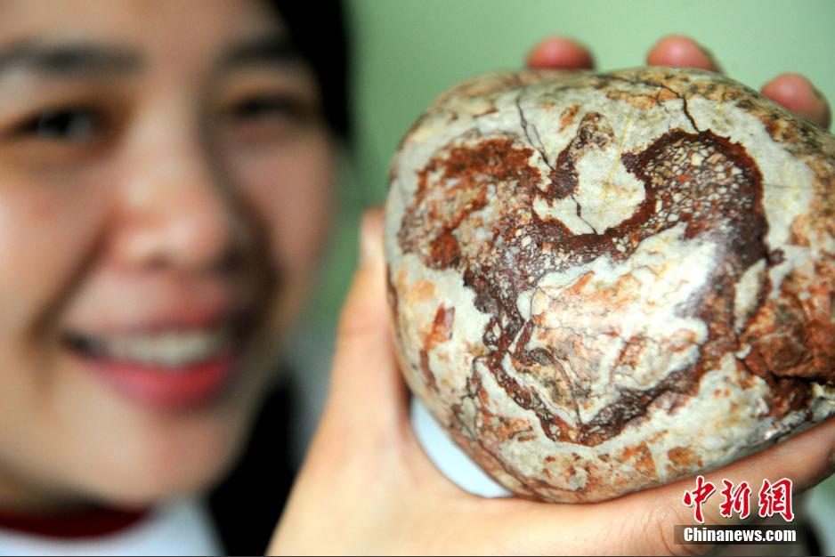 央廣網(wǎng)河南分網(wǎng)消息 據(jù)中國新聞網(wǎng)報道:1月9日,福建省福州市一奇石收藏者展示“中國地圖”奇石。這枚鵝卵石上天然形成了一個寬8厘米、高6.6厘米的紅褐色圖案,外形酷似一幅中國大陸版圖。這枚鵝卵石是20多年前在甘肅省和政縣廣通河河畔發(fā)現(xiàn)的,重1.39公斤,質(zhì)地堅硬、色澤艷麗、紋理清晰、橢圓秀美。(張晴 攝)