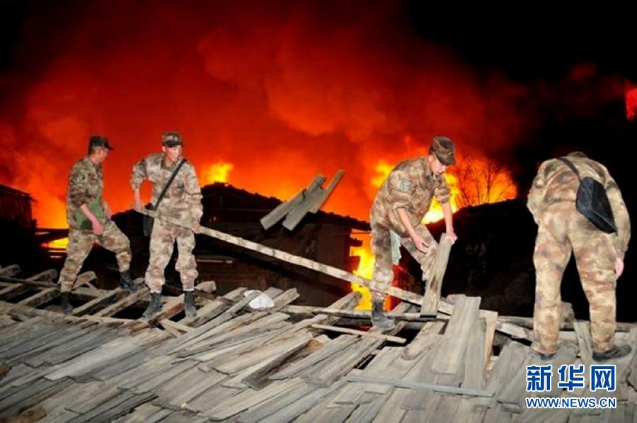 1月11日,部隊官兵在獨克宗古城火災(zāi)現(xiàn)場設(shè)置隔離帶,防止大火蔓延(手機拍攝)。
