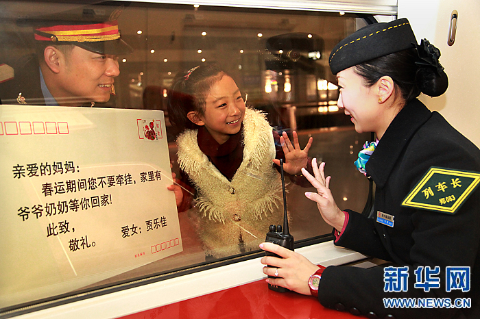 1月12日,列車長賈慧斌(左)和女兒賈樂佳一起到車站給出乘的媽媽送上家書。